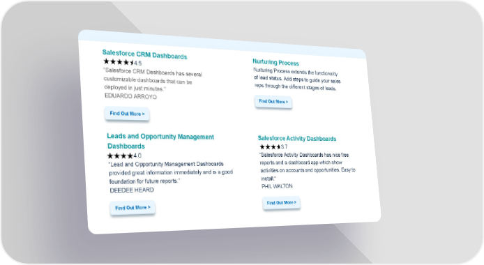 Salesforce CRM Dashboards Nurturing Process 4.5 Nurturing Process extends the functionality “Salesforce CRM Dashboards has several of lead status. Add steps to guide your sales customizable dashboards that can be reps through the different stages of leads. deployed in just minutes.” EDUARDO ARROYO Find Out More > Find Out More > Leads and Opportunity Management Salesforce Activity Dashboards 3.7 Dashboards “Salesforce Activity Dashboards has nice free 4.0 reports and a dashboard app which show “Lead and Opportunity Management Dashboards activities on accounts and opportunities. Easy to provided great information immediately and is a good install.” foundation for future reports.” PHIL WALTON DEEDEE HEARD Find Out More > Find Out More >