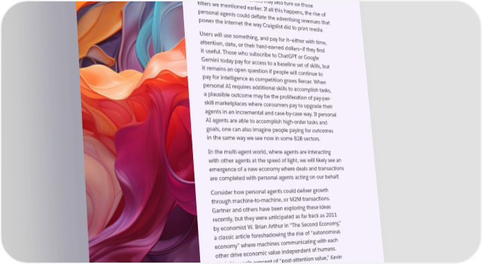 3 SALESFORSALESFORCE FUTURESCE FUTURES ANTICIPATING PERSONAL AGENTS: VIABILITY Agent gatekeepers with access to vast stores of knowledge might radically diminish the habits of consumer research and comparison, which is where discovery-focused advertising lives. Consumers may also turn on those filters we mentioned earlier. If all this happens, the rise of personal agents could deflate the advertising revenues that power the internet the way Craigslist did to print media. Users will use something, and pay for it—either with time, attention, data, or their hard-earned dollars—if they find it useful. Those who subscribe to ChatGPT or Google Gemini today pay for access to a baseline set of skills, but it remains an open question if people will continue to pay for intelligence as competition grows fiercer. When personal AI requires additional skills to accomplish tasks, a plausible outcome may be the proliferation of pay-per- skill marketplaces where consumers pay to upgrade their agents in an incremental and case-by-case way. If personal AI agents are able to accomplish high-order tasks and goals, one can also imagine people paying for outcomes in the same way we see now in some B2B sectors. In the multi-agent world, where agents are interacting with other agents at the speed of light, we will likely see an emergence of a new economy where deals and transactions are completed with personal agents acting on our behalf. Consider how personal agents could deliver growth through machine-to-machine, or M2M transactions. Gartner and others have been exploring these ideas recently, but they were anticipated as far back as 2011 by economist W. Brian Arthur in “The Second Economy,” a classic article foreshadowing the rise of “autonomous economy” where machines communicating with each other drive economic value independent of humans. Chris Noessel’s concept of “post-attention value,” Kevin Ashton’s “Internet of Things,” and other ideas also point us to new opportunities this world presents. ISSUE 1: PERSONAL AI | 24