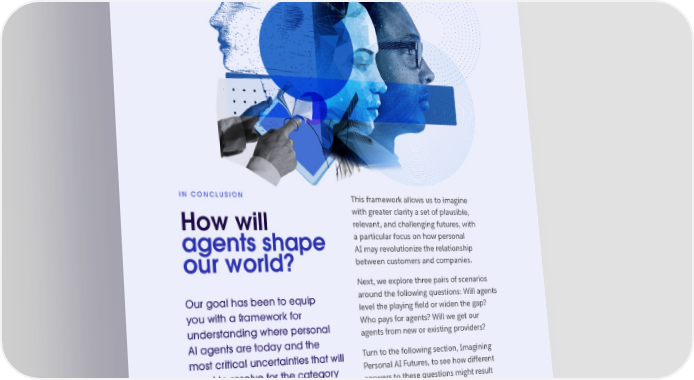 SALESFORSALESFORCE FUTURESCE FUTURES IN CONCLUSION This framework allows us to imagine with greater clarity a set of plausible, How will relevant, and challenging futures, with agents shape a particular focus on how personal AI may revolutionize the relationship our world? between customers and companies. Next, we explore three pairs of scenarios Our goal has been to equip around the following questions: Will agents you with a framework for level the playing field or widen the gap? understanding where personal Who pays for agents? Will we get our agents from new or existing providers? AI agents are today and the most critical uncertainties that will Turn to the following section, Imagining need to resolve for the category Personal AI Futures, to see how different to truly emerge. But the question answers to these questions might result of how feasible, desirable, and in very different futures, experience what those futures might look and feel like, viable personal agents will and learn the key questions and strategic only be answered over time. implications businesses should consider. ISSUE 1: PERSONAL AI | 26