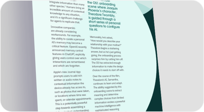 1 SALESFORSALESFORCE FUTURESCE FUTURES ANTICIPATING PERSONAL AGENTS: FEASIBILITY In a recent New York Times REASONING interview, the neuroscientist Charan Ragnarath points out, If you’ve seen Her, “we [humans] have a longer you’ll remember timeline in which we can the OS1 onboarding integrate information than many scene where Joaquin other species.” Humans bring an Phoenix’s character, incredible amount of contextual Theodore Twombly, knowledge to any situation, is guided through a and it’s a significant challenge short series of personal for agents to replicate that. questions to con昀椀gure Innovative companies his AI. are already considering workarounds. For example, Memorably, he’s asked, the ability to curate a personal “How would you describe your AI’s memory may become a relationship with your mother?” critical feature. OpenAI recently Theodore begins a stuttering announced memory control answer, but as he’s just getting features in ChatGPT, explicitly going, the onboarding process giving users control over which surprises him by cutting him off. interactions are remembered The OS has extracted enough and which are forgotten. information to make the design Apple’s new Journal App choices it needs to start off with. prompts users to add rich Over the course of the film, written or audio notes to Theodore’s AI, Samantha, contextual information the continues to learn and adapt. device already has access to, The ability suggested by this such as photos that were taken, onboarding scene to extract or locations where time was meaning and determine spent, or calendar appointments. complex choices from limited This is a potentially powerful information evokes a powerful step towards assembling a machine intelligence with full contextual understanding; sophisticated reasoning backwards-looking to begin capabilities. In reality, how such with but perhaps capable of reasoning might work informing a personal agent in at scale is an open question. the future. ISSUE 1: PERSONAL AI | 11