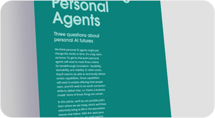 SALESFORSALESFORCE FUTURESCE FUTURES Anticipating Personal Agents Three questions about personal AI futures We think personal AI agents might just change the world, in time. It’s a big claim, we know. To get to that point personal agents will need to meet three criteria for breakthrough innovation — feasibility, desirability, and viability. In other words, they’ll need to be able to technically deliver certain capabilities, those capabilities will need to enable offerings that people want, and it’ll need to be worth someone’s while to deliver that, i.e. there’s a business model. None of those things are certain. In this article, we’ll lay out possible paths from where we are today, which we’ll then selectively bring to life in the speculative futures that follow. With the rapid pace of change in AI today, it’s really hard to identify the key drivers of change, let alone make accurate predictions. Our hope is that the framework we lay out helps readers sense-make their way through the torrent of new developments we’ll see in the coming months and years. ISSUE 1: PERSONAL AI | 7