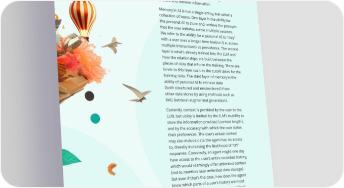 1 SALESFORSALESFORCE FUTURESCE FUTURES ANTICIPATING PERSONAL AGENTS: FEASIBILITY REMEMBERING For an autonomous agent to be useful, it needs to have memory: the capability to store and retrieve information. Memory in AI is not a single entity, but rather a collection of layers. One layer is the ability for the personal AI to store and retrieve the prompts that the user initiates across multiple sessions. We refer to the ability for a personal AI to “stay” with a user over a longer time horizon (i.e. across multiple interactions) as persistence. The second layer is what’s already trained into the LLM and how the relationships are built between the pieces of data that inform the training. There are limits to this layer such as the cutoff dates for the training data. The third layer of memory is the ability of personal AI to retrieve data (both structured and unstructured) from other data stores by using methods such as RAG (retrieval augmented generation). Currently, context is provided by the user to the LLM, but utility is limited by the LLM’s inability to store the information provided (context length), and by the accuracy with which the user states their preferences. The user’s actual context may also include data the agent has no access to, thereby increasing the likelihood of “off” responses. Conversely, an agent might one day have access to the user’s entire recorded history, which would seemingly offer unlimited context (not to mention near unlimited data storage). But even if that’s the case, how does the agent know which parts of a user’s history are most important, or which parts are more sensitive? The challenges with memory and meaning for LLMs echo the challenges of understanding how humans assign meaning to memory. ISSUE 1: PERSONAL AI | 10