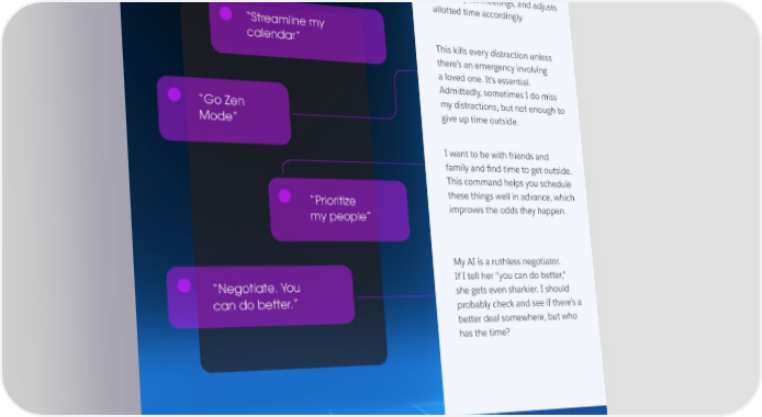 SPECULATIVE FUTURES #5 These are a few of my favorite prompts…. Scans all meetings, compares them to past meetings, and adjusts allotted time accordingly. “Streamline my calendar” This kills every distraction unless there’s an emergency involving a loved one. It’s essential. Admittedly, sometimes I do miss “Go Zen my distractions, but not enough to Mode” give up time outside. I want to be with friends and family and 昀椀nd time to get outside. This command helps you schedule “Prioritize these things well in advance, which my people” improves the odds they happen. My AI is a ruthless negotiator. “Negotiate. You If I tell her “you can do better,” can do better.” she gets even sharkier. I should probably check and see if there’s a better deal somewhere, but who has the time?