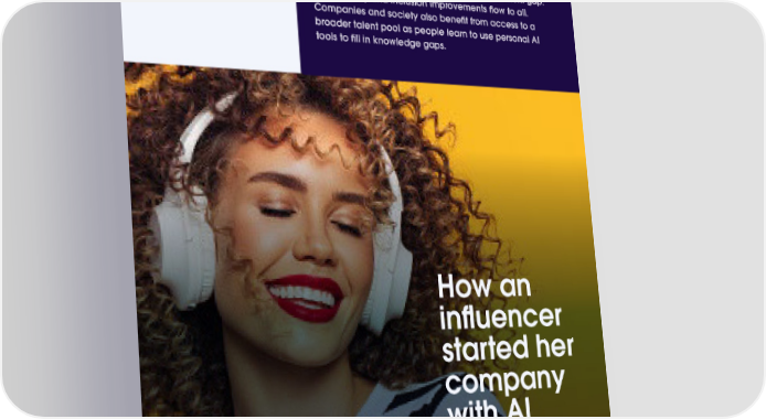 SPECULATIVE FUTURE #1 Personal AIs turn out to be great equalizers, What if AI delivering more access to education, career levels the coaching, and business services for those with the drive to access them. Broader availability of better tools playing 昀椀eld? expands opportunity and bridges the achievement gap. Accessibility and inclusion improvements 昀氀ow to all. Companies and society also bene昀椀t from access to a broader talent pool as people learn to use personal AI tools to 昀椀ll in knowledge gaps. How an in昀氀uencer started her company with AI In 4 steps