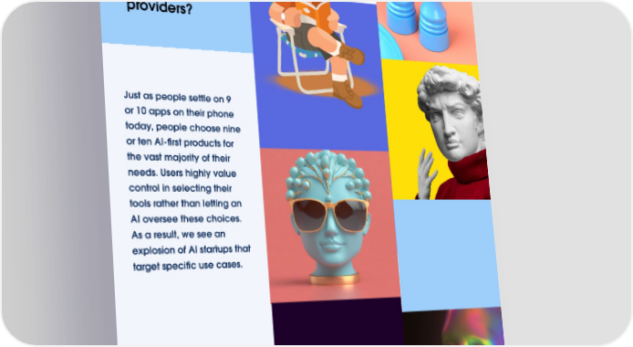 SPECULSPECULAATIVE FUTURES #2TIVE FUTURES #6 What if What if agents personal widen the AI comes gap? from new providers? Just as people settle on 9 or 10 apps on their phone today, people choose nine or ten AI-昀椀rst products for the vast majority of their needs. Users highly value control in selecting their tools rather than letting an AI oversee these choices. As a result, we see an explosion of AI startups that target speci昀椀c use cases.
