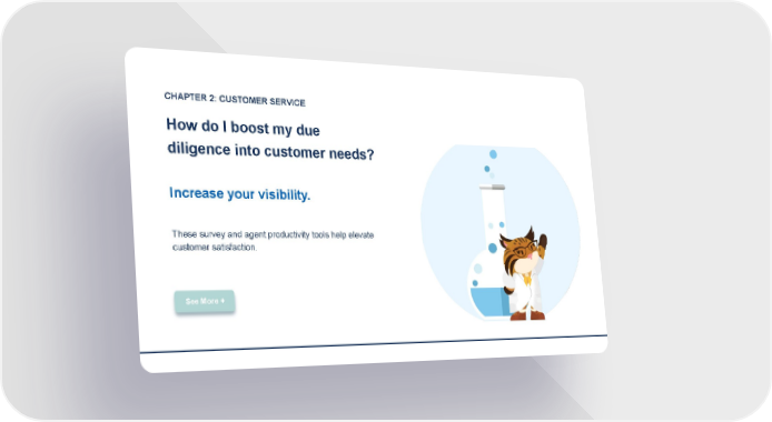 CHAPTER 2: CUSTOMER SERVICE How do I boost my due diligence into customer needs? Increase your visibility. These survey and agent productivity tools help elevate customer satisfaction. See More +
