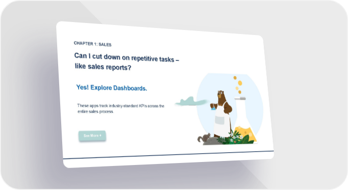 CHAPTER 1: SALES Can I cut down on repetitive tasks – like sales reports? Yes! Explore Dashboards. These apps track industry-standard KPIs across the entire sales process. See More +