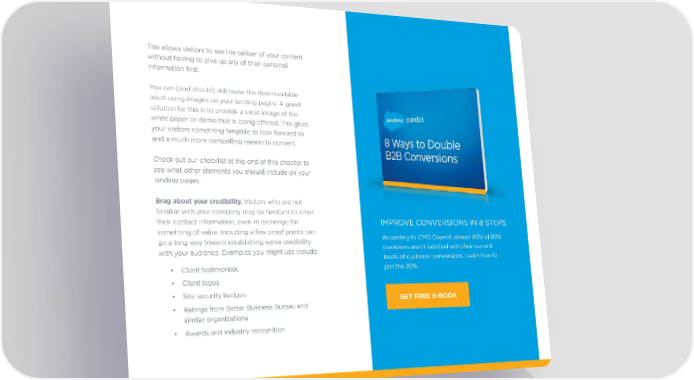This allows visitors to see the caliber of your content without having to give up any of their personal information first. You can (and should) still tease the downloadable asset using images on your landing pages. A good solution for this is to provide a small image of the white paper or demo that is being offered. This gives your visitors something tangible to look forward to and a much more compelling reason to convert. Check out our checklist at the end of this chapter to see what other elements you should include on your landing pages. Brag about your credibility. visitors who are not familiar with your company may be hesitant to enter their contact information, even in exchange for IMPROve COnveRSIOnS In 8 STePS. something of value. Including a few proof points can According to CMO Council, almost 80% of B2B go a long way toward establishing some credibility marketers aren’t satisfied with their current with your audience. examples you might use include: levels of customer conversions. Learn how to • Client testimonials join the 20%. • Client logos • Site security badges GET FREE E-BOOK • Ratings from Better Business Bureau and similar organizations • Awards and industry recognition