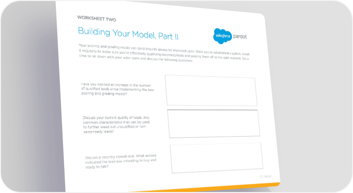 wORKSHEET TwO Building Your Model, Part II Your scoring and grading model can (and should) always be improved upon. Once you’ve established a system, revisit it regularly to make sure you’re effectively qualifying incoming leads and passing them off at the right moment. Set a time to sit down with your sales team and discuss the following questions: Have you noticed an increase in the number of qualified leads since implementing the new scoring and grading model? Discuss your current quality of leads. Any common characteristics that can be used to further weed out unqualified or non- sales-ready leads? Discuss a recently closed deal. What actions indicated the lead was intending to buy and ready to talk? 17 / Pardot