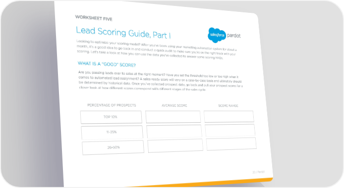 wORKSHEET FIvE Lead Scoring Guide, Part I Looking to optimize your scoring model? After you’ve been using your marketing automation system for about a month, it’s a good idea to go back in and conduct a quick audit to make sure you’re on the right track with your scoring. Let’s take a look at how you can use the data you’ve collected to answer some scoring fAQs. WHAT IS A “GOOD” SCORe? Are you passing leads over to sales at the right moment? Have you set the threshold too low or too high when it comes to automated lead assignment? A sales-ready score will vary on a case-by-case basis and ultimately should be determined by historical data. Once you’ve collected prospect data, go back and pull your prospect scores for a closer look at how different scores correspond with different stages of the sales cycle. PeRCenTAGe Of PROSPeCTS AveRAGe SCORe SCORe RAnGe TOP 10% 11-25% 26-50% 20 / Pardot