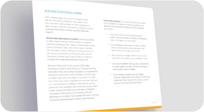 BUILDInG fUnCTIOnAL fORMS With landing pages, less is more. Companies that Follow best practices. Don’t just think about the number ask for more than a handful of data points in the of form fields; think about how they’re organized. Here first interaction with a visitor are encouraging form are some best practices for setting up and formatting abandonment. How can marketers use forms to collect your forms: prospect information without overwhelming their buyers? • If you have a short list of mutually exclusive options, use a radio button instead of a dropdown Decide what information to collect. One thing to keep menu. This helps users scan faster. in mind when it comes to forms: there is an inverse • Use checkboxes when users can select multiple relationship between the number of form fields and the values simultaneously or when giving a single form’s conversion rates. One of the biggest mistakes option that can be toggled on and off. that marketers make is asking too many questions on their forms. A general rule of thumb is to keep it to • When you need a single selection, but you have five fields or fewer, which means that you’ll need to more than a few options, use a dropdown menu. prioritize the most important information first. • Only select a default when you are confident that Because of the multi-touch nature of B2B sales, the vast majority of users will select that option, marketers shouldn’t panic if they can’t collect all of the and ensure it’s clearly labeled. information they want about a prospect during that first interaction. each touch point provides an opportunity • If your labels are beside your form fields, to collect more data and build up a prospect’s profile consider making them right-aligned for enhanced over time. If you have a marketing automation tool, you readability. If form length isn’t an issue, use top- can use progressive profiling to dynamically present alignment for even faster form-filling. users with new questions each time they access a form (while hiding fields that they’ve already completed). This lessens the burden on prospects, while still allowing you to collect the valuable information that the marketing and sales teams need to move forward. 7 / Pardot