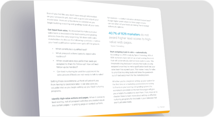 even if you feel like you don’t have enough information for example — a better indication of intent to purchase? on your prospects yet, start with a guess and adjust your Assign higher point values to these pages so you model later. Here are a few items to consider as you can see which of your leads are taking “hand-raising” begin building a scoring and grading model of your own: actions at a glance. Get input from sales. It’s important to make sure your 40.7% of B2B marketers do not sales team is involved in the lead scoring and grading award higher lead scores to high- process from the very beginning. Sit down with sales stakeholders to discuss the following questions — before value web pages. your lead qualification system even gets off the ground. - Spear Marketing • What constitutes a qualified lead? Start assigning leads to sales — automatically. • What prospect actions typically signal sales According to a 2015 study by Spear Marketing, 46% of readiness? B2B marketers have not set up a lead scoring threshold • When would sales reps prefer that leads get that will automatically alert or route leads to sales. This assigned to them for follow-up? How will lead threshold is key because it ensures that leads are only follow-up be handled? assigned once they’ve met a qualification level that your • Can lead nurturing be used to supplement the sales team has agreed upon. This makes it easy for sales sales process if leads are not ready to talk to sales? to prioritize incoming leads and takes the guesswork out of lead assignment for the marketing team. Setting these expectations up front will prevent you Whether you’re a beginner setting up your system for from having to backtrack later. It can also give you the first time or a marketing automation pro looking valuable intel as you begin setting up your lead nurturing to fine-tune your scoring and grading system, the programs. worksheets provided on the next few pages will give you a helpful foundation to start from. Then, move on to Identify high-value actions and pages. When it comes to chapter three to learn more about setting up effective lead scoring, not all prospect activities are created equal. nurturing programs for the leads in your database that Are certain pages — a pricing page or contact us form, aren’t yet sales-ready. 15 / Pardot