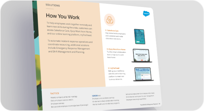 SOLUTIONS How You Work To help employees work together remotely and learn new skills during the crisis, customers can 1 | Salesforce Care access Salesforce Care, Quip Work from Home, Stay connected to employees and our online learning platform, myTrailhead. and customers and make data-driven decisions. To automate incident response operations and coordinate resourcing, additional solutions include Emergency Response Management 2 | Quip Work from Home and Shift Management and Planning. Try this virtual collaboration tool to help teams work from home. 3 | myTrailhead Skill up your workforce with this online learning platform to meet new business demands. TACTICS Weekly company all-hands meetings V2MOM app Self-service help center for employee crisis needs Daily employee success emails Employee and candidate journeys Omni-channel workspace for case management Employee surveys On-demand virtual collaboration training Employee resource groups (ERGs) Bot-assisted employee knowledge base (Concierge) Mental health and mindfulness programs The COVID-19 Response Playbook | 36