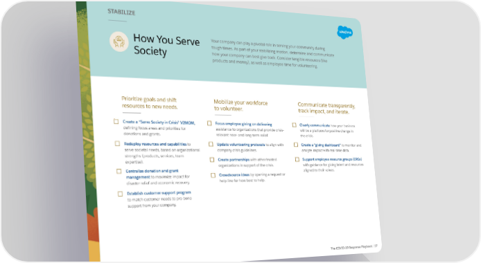 STABILIZE How You Serve Your company can play a pivotal role in serving your community during tough times. As part of your stabilizing motion, determine and communicate Society how your company can best give back. Consider tangible resources (like products and money), as well as employee time for volunteering. Prioritize goals and shift Mobilize your workforce Communicate transparently, resources to new needs. to volunteer. track impact, and iterate. Create a “Serve Society in Crisis” V2MOM, Focus employee giving on delivering Clearly communicate how your business defining focus areas and priorities for assistance to organizations that provide crisis- will be a platform for positive change in donations and grants. relevant near- and long-term relief. the crisis. Redeploy resources and capabilities to Update volunteering protocols to align with Create a “giving dashboard” to monitor and serve societal needs, based on organizational company crisis guidelines. analyze impact with real-time data. strengths (products, services, team expertise). Create partnerships with other trusted Support employee resource groups (ERGs) organizations in support of the crisis. with guidance for giving talent and resources Centralize donation and grant aligned to their values. management to maximize impact for Crowdsource ideas by opening a request or disaster relief and economic recovery. help line for how best to help. Establish customer support program to match customer needs to pro bono support from your company. The COVID-19 Response Playbook | 17
