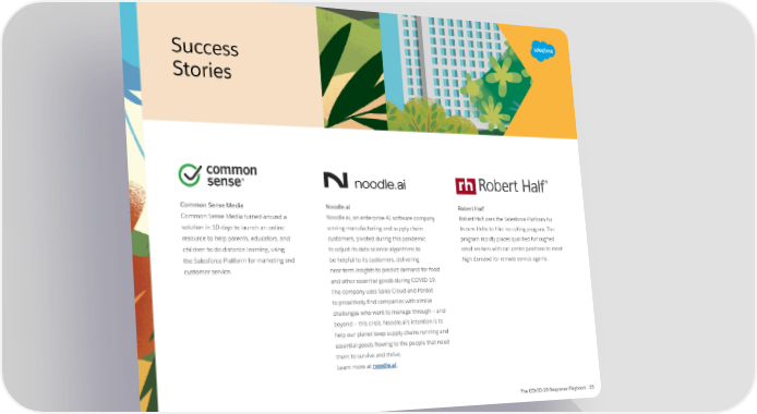 Success Customer Stories Features Common Sense Media Noodle.ai Robert Half Common Sense Media turned around a Noodle.ai, an enterprise AI software company Robert Half uses the Salesforce Platform for solution in 10 days to launch an online serving manufacturing and supply chain its new Hello to Hire recruiting program. The resource to help parents, educators, and customers, pivoted during this pandemic program rapidly places qualified furloughed children to do distance learning, using to adjust its data science algorithms to retail workers with call center positions to meet the Salesforce Platform for marketing and be helpful to its customers, delivering high demand for remote service agents. customer service. near-term insights to predict demand for food and other essential goods during COVID-19. The company uses Sales Cloud and Pardot to proactively find companies with similar challenges who want to manage through – and beyond – this crisis. Noodle.ai’s intention is to help our planet keep supply chains running and essential goods flowing to the people that need them to survive and thrive. Learn more at noodle.ai. The COVID-19 Response Playbook | 25