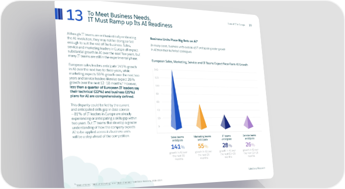 State of IT in Europe 13 To Meet Business Needs, 19 IT Must Ramp up Its AI Readiness Although IT teams are enthusiastically embracing Business Units Place Big Bets on AI* the AI revolution, they may not be doing so fast In many cases, business units outside of IT anticipate greater growth enough to suit the rest of the business. Sales, in AI than their technical colleagues. service and marketing leaders in Europe all expect substantial growth in AI over the next few years, but many IT teams are still in the experimental phase. European Sales, Marketing, Service and IT Teams Expect Near-Term AI Growth European sales leaders anticipate 141% growth 140 in AI over the next two to three years, while marketing expects 55% growth over the next two 120 years and service leaders likewise expect 26% growth over the next 12–18 months.* However, 100 less than a quarter of European IT leaders say their technical (22%) and business (25%) 80 plans for AI are comprehensively defined. 60 This disparity could be fed by the current and anticipated skills gap in data science 40 — 81% of IT leaders in Europe are already experiencing or anticipating a skills gap within 20 two years. But IT teams that develop a greater understanding of how the company expects 0 AI to be applied across its business units will be a step ahead of the competition. Sales teams Marketing teams IT teams Service teams anticipate anticipate anticipate anticipate 141% 55% 28% 26% growth in AI over growth in AI over growth in AI over growth in AI over the next 36 the next 24 the next 12–18 the next 12–18 months months months months Salesforce Research *“State of Sales,” “State of Marketing,” and “State of Service,” Salesforce Research, 2016–2017.
