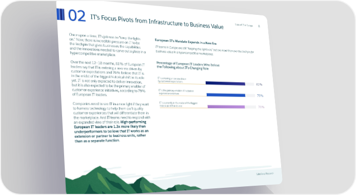 State of IT in Europe 02 IT’s Focus Pivots from Infrastructure to Business Value 8 Once upon a time, IT’s job was to “keep the lights European IT’s Mandate Expands in a New Era on.” Now, there is incredible pressure on IT to be IT teams in Europe are still “keeping the lights on,” but are more than ever the linchpin for the linchpin that gives businesses the capabilities business value in a hypercompetitive marketplace. and the innovations needed to carve out a place in a hypercompetitive marketplace. Over the next 12–18 months, 81% of European IT Percentage of European IT Leaders Who Believe leaders say that IT is entering a new era driven by the Following about IT’s Changing Role customer expectations and 76% believe that IT is in the midst of the biggest historical shift in its role IT is entering a new era driven yet. IT is not only expected to deliver innovation, by customer expectations 81% but it is also expected to be the primary enabler of customer experience initiatives, according to 79% IT is the primary enabler of customer of European IT leaders. experience initiatives 79% Companies need to see IT in a new light if they want IT is currently in the midst of the biggest to harness technology to help them craft quality historical shift in its role 76% customer experiences that will differentiate them in the marketplace. And IT teams need to respond with an expanded view of their role. High-performing European IT leaders are 1.3x more likely than underperformers to believe that IT works as an extension or partner to business units, rather than as a separate function. Salesforce Research