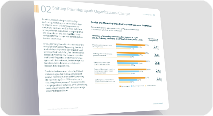 02Shifting Priorities Spark Organizational Change State of Marketing 18 As with successful sales partnerships, high- Service and Marketing Unite for Consistent Customer Experiences performing marketing and service teams align to ensure a more consistent experience for Top marketing teams are more than twice as likely as underperformers customers. Top teams are 2.2x more likely than to collaborate with their service counterpart. underperformers to alert service to special offers and promotions — and 2.5x more likely to say Percentage of Marketing Leaders Who Strongly Agree or Agree High Performers vs. service alerts them to suppress marketing when with the Following Statements about Their Relationships with Service Underperformers there’s a known issue. Since a company’s brand is often defined as “the Marketing and service collaborate 90% 2.1x on a regular basis 66% more likely sum of all conversations” happening, the role of 42% service in branding cannot be overstated. Most 87% service professionals, in fact, feel that service has Marketing alerts service to special 67% 2.2x the largest impact on how customers perceive promotions and offers 39% more likely their brand.* Regardless of whether marketing agrees with that sentiment, the takeaway is that 89% brand reputation depends on collaboration Marketing and service share 64% 2.3x common goals and metrics 39% more likely between these departments. Service collaborates with marketing 88% Thanks to the boom in social media, 65% of to manage and respond to social 64% 2.4x marketers agree that customers broadcast inquiries and issues 37% more likely positive experiences more publicly than they did five years ago (and 61% say the same Marketing is suppressed when a 81% 2.5x about negative experiences). To accommodate customer has an open service case 55% more likely changing customer behaviors, 64% of marketing 33% teams work in tandem with service to manage High performers Moderate performers Underperformers social inquiries and issues. * Salesforce Research “State of Service,” Salesforce Research, January 2017.