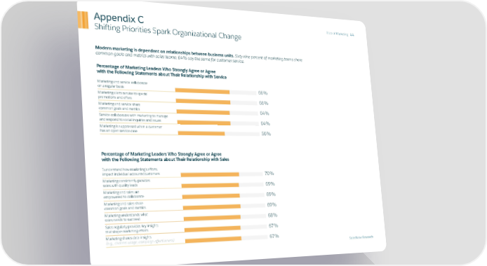 Appendix C State of Marketing 44 Shifting Priorities Spark Organizational Change Modern marketing is dependent on relationships between business units. Sixty-nine percent of marketing teams share common goals and metrics with sales teams; 64% say the same for customer service. Percentage of Marketing Leaders Who Strongly Agree or Agree with the Following Statements about Their Relationship with Service Marketing and service collaborate on a regular basis 66% Marketing alerts service to special promotions and offers 66% Marketing and service share common goals and metrics 64% Service collaborates with marketing to manage and respond to social inquiries and issues 64% Marketing is suppressed when a customer has an open service case 56% Percentage of Marketing Leaders Who Strongly Agree or Agree with the Following Statements about Their Relationship with Sales I understand how marketing’s efforts impact individual accounts/customers 70% Marketing consistently provides sales with quality leads 69% Marketing and sales are empowered to collaborate 69% Marketing and sales share common goals and metrics 69% Marketing understands what sales needs to succeed 68% Sales regularly provides key insights that shape marketing efforts 67% Marketing shares data insights (e.g., channel usage, campaign effectiveness) 67% Salesforce Research