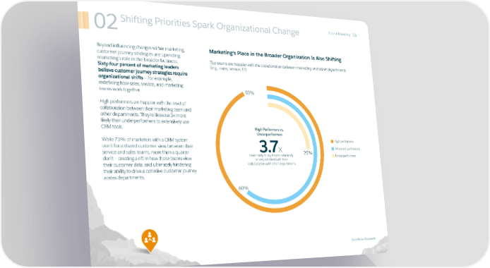 02Shifting Priorities Spark Organizational Change State of Marketing 15 Beyond influencing changes within marketing, Marketing’s Place in the Broader Organization Is Also Shifting customer journey strategies are upending marketing’s role in the broader business. Top teams are happier with the collaboration between marketing and other departments Sixty-four percent of marketing leaders (e.g., sales, service, IT). believe customer journey strategies require organizational shifts — for example, redefining how sales, service, and marketing teams work together. 93% High performers are happier with the level of collaboration between their marketing team and other departments. They’re likewise 3x more likely than underperformers to extensively use CRM tools. High Performers vs. Underperformers While 73% of marketers with a CRM system High performers use it for a shared customer view between their 3.7x Moderate performers service and sales teams, more than a quarter more likely to say they’re extremely 25% Underperformers don’t — creating a rift in how those teams view or very satisfied with their their customer data, and ultimately hindering collaboration with other departments their ability to drive a cohesive customer journey across departments. 60% Salesforce Research