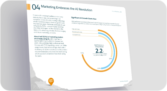 04Marketing Embraces the AI Revolution State of Marketing 23 It seems AI is making headlines across every Significant AI Growth Starts Now industry these days, and marketing is no exception. In fact, AI is the leading technology High performers are ahead of the curve in their AI usage, but more than a quarter of overall where marketers expect the most growth over marketers (regardless of performance level) plan to begin using AI within a two-year timeframe. the next two years. Marketers anticipate AI use will grow by 53% — a much higher rate than any other tech types. As the new kid on the High performers block, AI is attracting attention for its emerging Moderate performers and future marketing use cases. Underperformers About half (51%) of marketing leaders are already using AI, with more than a quarter planning to pilot it in the next two years. Unsurprisingly, high performers lead the way with 72% reporting current use. While High Performers vs. usage seems high for a tech type that’s still in Underperformers its infancy, AI has its roots in tactics like product recommendations and predictive lead scoring, 72% 2.2x which successful marketers have been using more likely to say they’re currently for years. using artificial intelligence (AI) 32% 50% Salesforce Research