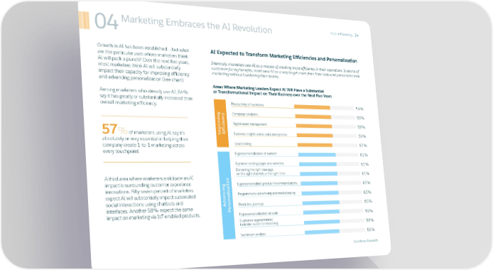 04Marketing Embraces the AI Revolution State of Marketing 24 Growth in AI has been established — but what AI Expected to Transform Marketing Efficiencies and Personalization are the particular uses where marketers think AI will pack a punch? Over the next five years, Internally, marketers see AI as a means of creating more efficiency in their operations. In terms of most marketers think AI will substantially customer-facing benefits, most view AI as a way to get more from their data and personalize their impact their capacity for improving efficiency marketing without burdening their teams. and advancing personalization (see chart). Areas Where Marketing Leaders Expect AI Will Have a Substantial Among marketers who already use AI, 64% or Transformational Impact on Their Business over the Next Five Years say it has greatly or substantially increased their overall marketing efficiency. Productivity of marketers 59% ving Campaign analytics 59% o ficiencyDigital asset management 59% 57% of marketers using AI say it’s ImprEf Business insights across data and systems 59% absolutely or very essential in helping their company create 1-to-1 marketing across Lead scoring 57% every touchpoint. Hyperpersonalization of content 61% Dynamic landing pages and websites 61% Delivering the right message, A third area where marketers anticipate an AI on the right channel, at the right time 61% impact is surrounding customer experience tionHyperpersonalized product recommendations 60% innovations. Fifty-seven percent of marketers expect AI will substantially impact automated ancingalizaProgrammatic advertising and media buying 60% social interactions using chatbots and dv interfaces. Another 58% expect the same A ersonPredictive journeys 60% P impact on marketing via IoT-enabled products. Hyperpersonalization at scale 59% Customer segmentation/ lookalike audience modeling 58% Sentiment analysis 56% Salesforce Research