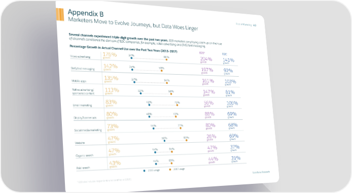 Appendix B State of Marketing 40 Marketers Move to Evolve Journeys, but Data Woes Linger Several channels experienced triple-digit growth over the past two years. B2B marketers are playing catch-up on their use of channels considered the domain of B2C companies, for example, video advertising and SMS/text messaging. Percentage Growth in Actual Channel Use over the Past Two Years (2015–2017) B2B* B2C 176% 24% 66% 204% 141% Video advertising growth growth growth 142% 24% 59% 197% 92% SMS/text messaging growth growth growth 135% 27% 64% 161% 103% Mobile apps growth growth growth Native advertising/ 113% 32% 68% 147% 81% sponsored content growth growth growth 83% 41% 75% 56% 106% Email marketing growth growth growth 80% 40% 72% 88% 69% Display/banner ads growth growth growth 73% 44% 77% 80% 68% Social media marketing growth growth growth 47% 56% 83% 26% 69% Website growth growth growth 47% 44% 64% 47% 37% Organic search growth growth growth 43% 44% 63% 44% 31% Paid search growth growth growth 2015 usage 2017 usage * B2B also includes respondents who identified as B2B2C. Salesforce Research