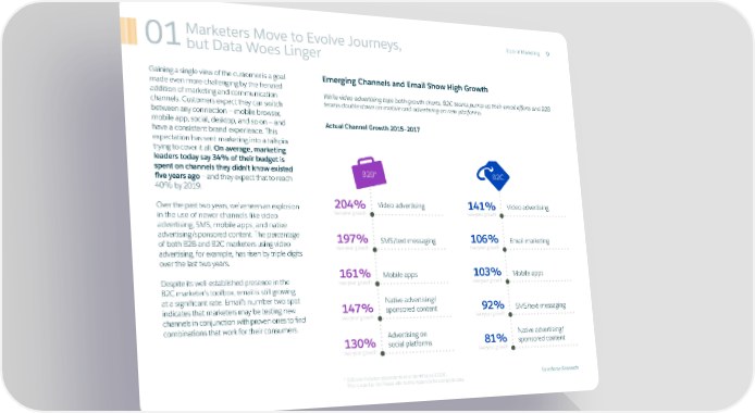 01Marketers Move to Evolve Journeys, State of Marketing 9 but Data Woes Linger Gaining a single view of the customer is a goal Emerging Channels and Email Show High Growth made even more challenging by the frenzied addition of marketing and communication While video advertising tops both growth charts, B2C teams pump up their email efforts and B2B channels. Customers expect they can switch teams double down on mobile and advertising on new platforms. between any connection — mobile browser, mobile app, social, desktop, and so on — and Actual Channel Growth 2015–2017 have a consistent brand experience. This expectation has sent marketing into a tailspin trying to cover it all. On average, marketing leaders today say 34% of their budget is spent on channels they didn’t know existed B2B* B2C five years ago — and they expect that to reach 40% by 2019. Over the past two years, we’ve seen an explosion 204% Video advertising 141% Video advertising in the use of newer channels like video two-year growth two-year growth advertising, SMS, mobile apps, and native advertising/sponsored content. The percentage 197% SMS/text messaging 106% Email marketing of both B2B and B2C marketers using video two-year growth two-year growth advertising, for example, has risen by triple digits over the last two years. Despite its well-established presence in the 161% Mobile apps 103% Mobile apps two-year growth two-year growth B2C marketer’s toolbox, email is still growing at a significant rate. Email’s number two spot Native advertising/ indicates that marketers may be testing new 147% sponsored content 92% SMS/text messaging channels in conjunction with proven ones to find two-year growth two-year growth combinations that work for their consumers. 130% Advertising on 81% Native advertising/ social platforms sponsored content two-year growth two-year growth * B2B also includes respondents who identified as B2B2C. Salesforce Research This is a partial list. Please refer to the Appendix for complete data.
