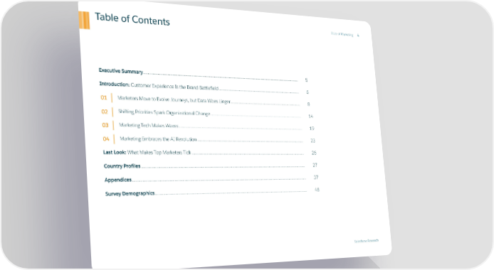 Table of Contents State of Marketing 4 Executive Summary ..................................................................................................................................................... 5 Introduction: Customer Experience Is the Brand Battlefield ................................................................................ 6 Marketers Move to Evolve Journeys, but Data Woes Linger ...................................................................... 8 01 Shifting Priorities Spark Organizational Change .......................................................................................... 14 02 Marketing Tech Makes Waves ........................................................................................................................ 19 03 Marketing Embraces the AI Revolution ........................................................................................................ 23 04 Last Look: What Makes Top Marketers Tick .............................................................................................................. 26 Country Profiles ............................................................................................................................................................ 27 Appendices .................................................................................................................................................................... 37 Survey Demographics ................................................................................................................................................. 48 Salesforce Research