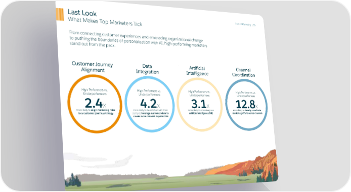 State of Marketing Last Look 26 What Makes Top Marketers Tick From connecting customer experiences and embracing organizational change to pushing the boundaries of personalization with AI, high-performing marketers stand out from the pack. Customer Journey Data Artificial Channel Alignment Integration Intelligence Coordination High Performers vs. High Performers vs. High Performers vs. High Performers vs. Underperformers Underperformers Underperformers Underperformers 2.4x 4.2x 3.1x 12.8x more likely to align marketing roles more likely to be satisfied with their more likely to extensively use more likely to heavily coordinate to a customer journey strategy ability to leverage customer data to artificial intelligence (AI) marketing efforts across channels create more relevant experiences