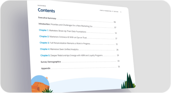 TH SALESFORCE STATE OF MARKETING, 9 EDITION 5 Contents Executive Summary ............................................................... 06 Introduction: Priorities and Challenges for a New Marketing Era ......................... 07 Chapter 1: Marketers Shore Up Their Data Foundations ................................ 12 Chapter 2: Marketers Embrace AI With an Eye on Trust................................. 17 Chapter 3: Full Personalization Remains a Work in Progress ............................. 21 Chapter 4: Marketers Seek Unified Analytics .......................................... 26 Chapter 5: Deeper Relationships Emerge with ABM and Loyalty Programs ................ 29 Survey Demographics ............................................................. 33 Appendix ........................................................................ 35