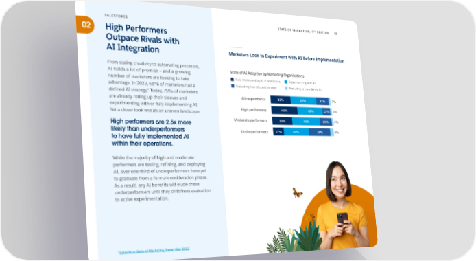 TH SALESFORCE STATE OF MARKETING, 9 EDITION 18 02 High Performers Outpace Rivals with AI Integration Marketers Look to Experiment With AI Before Implementation From scaling creativity to automating processes, AI holds a lot of promise — and a growing State of AI Adoption by Marketing Organizations number of marketers are looking to take Fully implementing AI in operations Experimenting with AI advantage. In 2022, 68% of marketers had a Evaluating how AI could be used Not using or considering AI defined AI strategy.* Today, 75% of marketers are already rolling up their sleeves and All respondents 32% 43% 21% 3% experimenting with or fully implementing AI. High performers 42% 42% 13% 3% Yet a closer look reveals an uneven landscape. High performers are 2.5x more Moderate performers 32% 46% 20% 3% likely than underperformers Underperformers 17% 41% 36% 6% to have fully implemented AI within their operations. While the majority of high and moderate performers are testing, refining, and deploying AI, over one-third of underperformers have yet to graduate from a formal consideration phase. As a result, any AI benefits will elude these underperformers until they shift from evaluation to active experimentation. *Salesforce State of Marketing, November 2022
