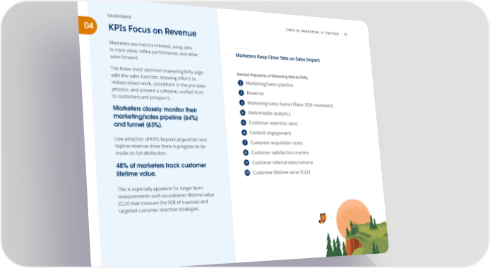 TH SALESFORCE STATE OF MARKETING, 9 EDITION 27 04 KPIs Focus on Revenue Marketers are metrics-minded, using data to track value, refine performance, and drive Marketers Keep Close Tabs on Sales Impact sales forward. The three most common marketing KPIs align Ranked Popularity of Marketing Metrics/KPIs with the sales function, showing efforts to 1 Marketing/sales pipeline reduce siloed work, coordinate in the pre-sales process, and present a cohesive, unified front 2 Revenue to customers and prospects. 3 Marketing/sales funnel (Base: B2B marketers) Marketers closely monitor their 4 Web/mobile analytics marketing/sales pipeline (64%) 5 Customer retention rates and funnel (63%). 6 Content engagement Low adoption of KPIs beyond acquisition and 7 Customer acquisition costs topline revenue show there is progress to be made on full attribution. 8 Customer satisfaction metrics 48% of marketers track customer 9 Customer referral rates/volume lifetime value. 10 Customer lifetime value (CLV) This is especially apparent for longer term measurements such as customer lifetime value (CLV) that measure the ROI of nuanced and targeted customer retention strategies.