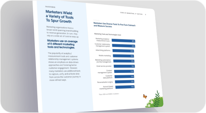 TH SALESFORCE STATE OF MARKETING, 9 EDITION 9 Marketers Wield a Variety of Tools To Spur Growth Marketers Use Diverse Tools To Fine-Tune Outreach and Measure Success Marketing organizations have a broad remit spanning brand-building to revenue generation. In turn, they Marketing Tools and Technologies Used rely on a wide set of tools to keep up. Marketing analytics/ measurement tools 88% Marketers use an average Customer relationship of 8 different marketing management system 86% tools and technologies. Advertising platforms 80% The popularity of analytics/ measurement tools and customer Mobile marketing 78% relationship management systems Marketing automation/ 78% shows an emphasis on data-driven journey management approaches and fostering better Email service provider 78% customer engagement. However, many marketers use additional tools Content 73% to capture, unify, and activate data management system from across the customer journey in Customer 72% more refined ways. data platform Personalization engine 71% Account based 70% marketing platform* *Base: B2B and B2B2C marketers