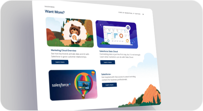 TH SALESFORCE STATE OF MARKETING, 9 EDITION 38 Want More? Marketing Cloud Overview Salesforce Data Cloud See how top brands activate data and AI with Centralizing data is just the first step, but it’s not enough. Salesforce to grow customer relationships. Learn what marketers can do with Data Cloud. Learn more Learn more Salesforce+ Get inspired with free access to award-winning content for business professionals. Learn more