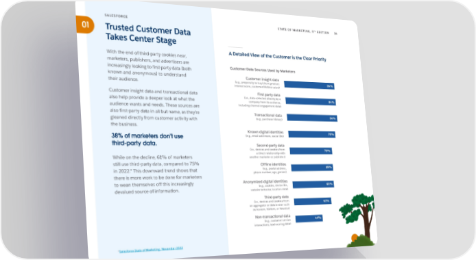 TH SALESFORCE STATE OF MARKETING, 9 EDITION 14 01 Trusted Customer Data Takes Center Stage A Detailed View of the Customer is the Clear Priority With the end of third-party cookies near, marketers, publishers, and advertisers are Customer Data Sources Used by Marketers increasingly looking to first-party data (both known and anonymous) to understand Customer insight data their audience. (e.g., propensity to buy/churn,product 84% interest score, customer lifetime value) Customer insight data and transactional data First party data also help provide a deeper look at what the (i.e., data collected directly by a 84% company from its audience, audience wants and needs. These sources are including channel engagement data) also first-party data in all but name,as they’re Transactional data 84% gleaned directly from customer activity with (e.g., purchase history) the business. Known digital identities 78% 38% of marketers don't use (e.g., email addresses, social IDs) third-party data. Second-party data (i.e., devices and cookies from 70% a direct relationship with While on the decline, 61% of marketers another marketer or publisher) still use third-party data, compared to 75% Offline identities in 2022.* This downward trend shows that (e.g., postal address, 69% there is more work to be done for marketers phone number, age, gender) to wean themselves off this increasingly Anonymized digital identities devalued source of information. (e.g., cookies, device IDs, 68% website behavior, location data) Third-party data (i.e., devices and cookies from 61% an aggregator or data broker such as Acxiom, Nielsen, or Neustar) Non-transactional data 44% (e.g., customer service interactions, lead-scoring data) *Salesforce State of Marketing, November 2022