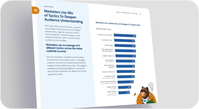 TH SALESFORCE STATE OF MARKETING, 9 EDITION 13 01 Marketers Use Mix of Tactics To Deepen Audience Understanding Marketers Use a Wide Array of Strategies To Capture Data With every click and conversation, customers Marketing Tactics Used and prospects leave behind a trail of digital breadcrumbs. Eager to make the most of Customer service data 88% every interaction, marketers deploy a wide variety of tactics to collect clues for better Transaction data 82% audience understanding. Marketers use an average of 9 Mobile apps 82% different tactics across the entire Web registration/ 82% customer journey. account creation Loyalty programs 80% Ever the innovators, marketers are branching out from the most popular tactics — leveraging Subscriptions 75% customer service and commerce data that falls (e.g., newsletter) outside of their traditional purview. This suggests Online learning 72% marketers are patching together a connected platform view of their customers and taking a full-funnel Access to discounts 71% approach to data. Interactive tools 68% (e.g., quizzes, calculators) Cause-based marketing 62% (e.g., Box Tops for Education) Digital tokens 50% (e.g., NFTs) Gated content (e.g., research, 43% webinars, e-books)