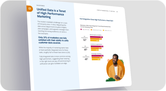 TH SALESFORCE STATE OF MARKETING, 9 EDITION 15 01 Unified Data is a Tenet of High Performance Marketing Full Integration Gives High Performers a Head Start The modern marketer's challenge isn't a lack of first-party data: it's fully integrating this Marketers With Fully-Integrated Cross-Departmental Data data across departments to glean insights, for the Following Tasks plan campaigns, and suppress messages from High performers Moderate performers Underperformers reaching the wrong audiences, to name a few examples. Performance analytics All 59% Only 31% of marketers are fully respondents 53% satisfied with their ability to unify 52% 40% customer data sources. Audience suppression All 57% While the majority of marketing teams have respondents 48% % 34% at least partially integrated data for these 48 tasks, roughly half or fewer have done so fully. Campaign building Fully integrated data is more common among All 54% respondents 48% high performers, suggesting that investing % 38% in the right tools can pay off and investing in 48 unification can give marketers an edge.