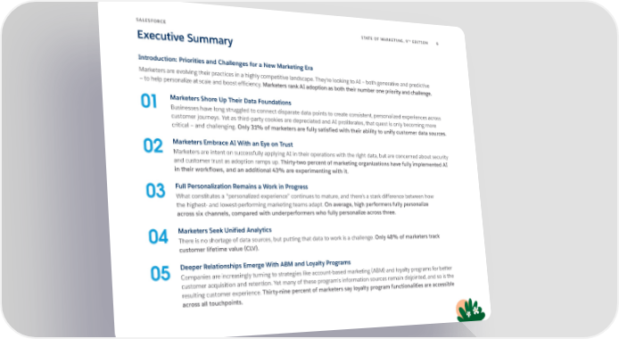 TH SALESFORCE STATE OF MARKETING, 9 EDITION 6 Executive Summary Introduction: Priorities and Challenges for a New Marketing Era Marketers are evolving their practices in a highly competitive landscape. They’re looking to AI — both generative and predictive — to help personalize at scale and boost efficiency. Marketers rank AI adoption as both their number one priority and challenge. 01 Marketers Shore Up Their Data Foundations Businesses have long struggled to connect disparate data points to create consistent, personalized experiences across customer journeys. Yet as third-party cookies are depreciated and AI proliferates, that quest is only becoming more critical — and challenging. Only 31% of marketers are fully satisfied with their ability to unify customer data sources. 02 Marketers Embrace AI With an Eye on Trust Marketers are intent on successfully applying AI in their operations with the right data, but are concerned about security and customer trust as adoption ramps up. Thirty-two percent of marketing organizations have fully implemented AI in their workflows, and an additional 43% are experimenting with it. 03 Full Personalization Remains a Work in Progress What constitutes a “personalized experience” continues to mature, and there’s a stark difference between how the highest- and lowest-performing marketing teams adapt. On average, high performers fully personalize across six channels, compared with underperformers who fully personalize across three. 04 Marketers Seek Unified Analytics There is no shortage of data sources, but putting that data to work is a challenge. Only 48% of marketers track customer lifetime value (CLV). 05 Deeper Relationships Emerge With ABM and Loyalty Programs Companies are increasingly turning to strategies like account-based marketing (ABM) and loyalty programs for better customer acquisition and retention. Yet many of these program's information sources remain disjointed, and so is the resulting customer experience. Thirty-nine percent of marketers say loyalty program functionalities are accessible across all touchpoints.