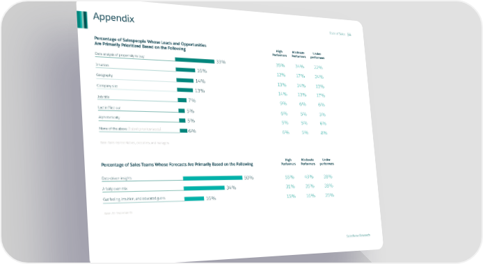 State of Sales 54 Appendix Percentage of Salespeople Whose Leads and Opportunities High Moderate Under- Are Primarily Prioritized Based on the Following Performers Performers performers Data analysis of propensity to buy 33% 35% 34% 22% Intuition 16% 12% 17% 24% Geography 14% 13% 14% 13% Company size 13% 14% 13% 17% Job title 7% 9% 6% 6% Last in/first out 5% 6% 5% 3% Alphabetically 5% 5% 5% 6% None of the above (I don’t prioritize leads) 6% 6% 5% 8% Base: Sales representatives, executives, and managers High Moderate Under- Percentage of Sales Teams Whose Forecasts Are Primarily Based on the Following Performers Performers performers Date-driven insights 50% 55% 49% 38% A fairly even mix 34% 31% 35% 38% Gut feeling, intuition, and educated guess 16% 15% 16% 25% Base: All respondents Salesforce Research