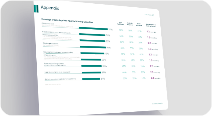State of Sales 49 Appendix High Moderate Under- High Performers vs. Percentage of Sales Reps Who Have the Following Capabilities Performers Performers performers Underperformers Collaboration tools (e.g., internal social networks, instant messaging) 57% 58% 58% 47% 1.3x more likely Market intelligence on customers/prospects 51% 53% 52% 36% 1.5x more likely Mobile sales capabilities (i.e., access and edit customer, account, and opportunity information from a mobile device) 50% 52% 46% 24% 2.2x more likely Fully integrated systems (i.e., linked data sources) 50% 55% 50% 29% 1.9x more likely Data insights on customers’ propensity to buy 46% 49% 51% 41% 1.2x more likely Offline data access (i.e., access and edit customer, account, and opportunity information without an internet connection) 39% 34% 42% 29% 1.2x more likely Automated surfacing of leads/ opportunities most likely to close 39% 42% 39% 19% 2.2x more likely Suggested next steps on an opportunity 37% 44% 35% 21% 2.1x more likely Alerts to key actions required on an opportunity 34% 35% 35% 12% 2.9x more likely Base: Sales representatives Salesforce Research