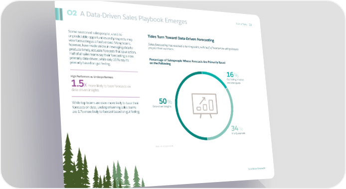 02 A Data-Driven Sales Playbook Emerges State of Sales 13 Some seasoned salespeople, used to Tides Turn Toward Data-Driven Forecasting unpredictable opportunities and prospects, may view forecasting as a fool’s errand. Many teams, Sales forecasting has reached a turning point, with half of teams now using data to however, have made strides in leveraging data to project their numbers. produce timely, accurate forecasts that spur action. Half of all sales teams say their forecasting is now Percentage of Salespeople Whose Forecasts Are Primarily Based primarily data-driven, while only 16% say it’s on the Following primarily based on gut feeling. 16% High Performers vs. Underperformers Gut feeling, intuition, 1.5X more likely to base forecasts on educated guess data-driven insights While top teams are even more likely to base their 50% forecasts on data, underperforming sales teams Data-driven insights are 1.7x more likely to forecast based on gut feeling. 34% A fairly even mix Base: All respondents Salesforce Research