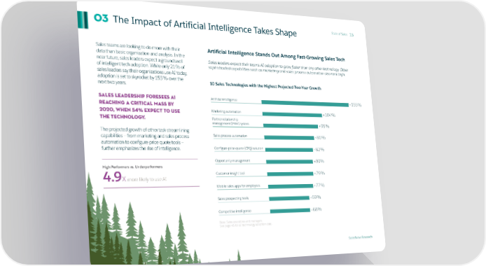 The Impact of Artificial Intelligence Takes Shape State of Sales 15 03 Sales teams are looking to do more with their Artificial Intelligence Stands Out Among Fast-Growing Sales Tech data than basic organization and analysis. In the near future, sales leaders expect a groundswell Sales leaders expect their teams AI adoption to grow faster than any other technology. Other of intelligent tech adoption. While only 21% of sophisticated capabilities such as marketing and sales process automation also rank high. sales leaders say their organizations use AI today, adoption is set to skyrocket by 155% over the 10 Sales Technologies with the Highest Projected Two-Year Growth next two years. Sales leadership foresees AI Artificial intelligence +155% reaching a critical mass by 2020, when 54% expect to use Marketing automation +104% the technology. Partner relationship management (PRM) system +95% The projected growth of other task-streamlining capabilities — from marketing and sales process Sales process automation +86% automation to configure-price-quote tools — further emphasizes the rise of intelligence. Configure-price-quote (CPQ) solution +82% Opportunity management +80% High Performers vs. Underperformers 4.9X more likely to use AI Customer insight tool +79% Mobile sales apps for employees +77% Sales prospecting tools +69% Competitive intelligence +68% Base: Sales executives and managers See page 45 for all technology adoption data. Salesforce Research
