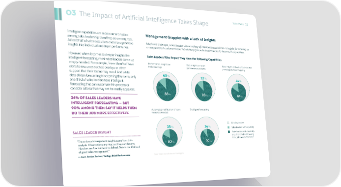 The Impact of Artificial Intelligence Takes Shape State of Sales 19 03 Intelligent capabilities are more commonplace Management Grapples with a Lack of Insights among sales leadership than they are among reps. At least half of sales executives and managers have Much like their reps, sales leaders view a variety of intelligent capabilities as helpful for catering to insights into individual and team performance. an empowered customer base. Yet relatively few sales leaders actually have such capabilities. However, when it comes to deeper insights like Sales Leaders Who Report They Have the Following Capabilities intelligent forecasting, most sales leaders come up empty-handed. For example, fewer than half have Performance insights on Data insights on team Data insights on book of business that alerts to resources such as overlays or other individual reps performance patterns provide guidance on targeting support that their teams may need. And while 60% data-driven forecasting is becoming the norm, only 52% 44% one-third of sales leaders have intelligent forecasting that can automate this process or consider criteria that may not be readily apparent. 88% 88% 84% 34% of sales leaders have intelligent forecasting β but 90% among them say it helps them Automated notification of team Intelligent forecasting do their job more effectively. resources needed All sales leaders 35% 34% Sales leaders with capability SALES LEADER INSIGHT Sales leaders with capability that find it helpful to doing βThe only real management insights come from data 82% 90% their jobs more effectively analysis. Observations are nice, but they can deceive. Hunches are fun, but hard to defend. Data is the lifeblood of great sales management.β β Jason Jordan, Partner, Vantage Point Performance Base: Sales executives and managers