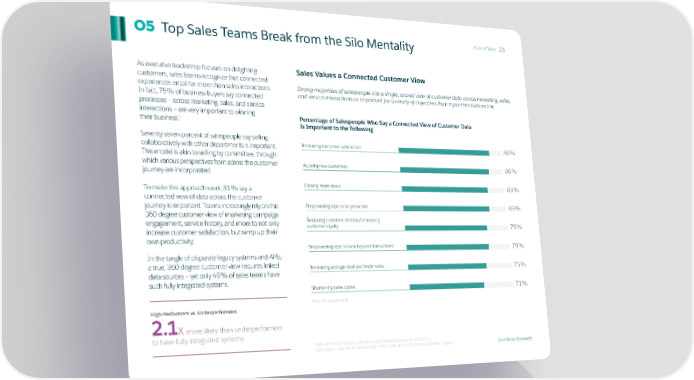 Top Sales Teams Break from the Silo Mentality State of Sales 23 05 As executive leadership focuses on delighting Sales Values a Connected Customer View customers, sales teams recognize that connected experiences entail far more than sales interactions. Strong majorities of salespeople cite a single, shared view of customer data across marketing, sales, In fact, 75% of business buyers say connected and service interactions as important for a variety of objectives that impact the bottom line. processes — across marketing, sales, and service interactions — are very important to winning Percentage of Salespeople Who Say a Connected View of Customer Data 1 their business. Is Important to the Following Seventy-seven percent of salespeople say selling collaboratively with other departments is important. Increasing customer satisfaction 88% This model is akin to selling by committee, through which various perspectives from across the customer Aquiring new customers 86% journey are incorporated. To make this approach work, 81% say a Closing more deals 83% connected view of data across the customer journey is important. Teams increasingly rely on this Empowering reps to be proactive 83% 360-degree customer view of marketing campaign engagement, service history, and more to not only Reducing customer attrition/increasing increase customer satisfaction, but ramp up their customer loyalty 79% own productivity. Empowering reps to look beyond transactions 79% In the tangle of disparate legacy systems and APIs, a true, 360-degree customer view requires linked Increasing average deal size/order value 75% data sources — yet only 49% of sales teams have such fully integrated systems. Shortening sales cycles 71% Base: All respondents High Performers vs. Underperformers 2.1X more likely than underperformers to have fully integrated systems 1 State of the Connected Customer survey, Salesforce Research, April 2018. Data may or may not be represented in the “State of the Connected Customer” report. Salesforce Research