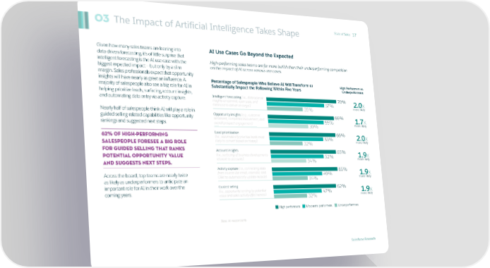 The Impact of Artificial Intelligence Takes Shape State of Sales 17 03 Given how many sales teams are leaning into AI Use Cases Go Beyond the Expected data-driven forecasting, it’s of little surprise that intelligent forecasting is the AI use case with the High-performing sales teams are far more bullish than their underperforming competition biggest expected impact — but only by a slim on the impact of AI across various use cases. margin. Sales professionals expect that opportunity insights will have nearly as great an influence. A Percentage of Salespeople Who Believe AI Will Transform or High Performers vs. majority of salespeople also see a big role for AI in Substantially Impact the Following Within Five Years Underperformers helping prioritize leads, surfacing account insights, Intelligent forecasting (i.e., data science and automating data entry via activity capture. insights on commit, open pipe, and 70% 2.0x likelihood to deliver on target) 57% more likely Nearly half of salespeople think AI will play a role in 35% guided selling-related capabilities like opportunity Opportunity insights (e.g., customer 66% sentiment, competitor involvement, and 55% 1.7x rankings and suggested next steps. overall prospect engagement) 39% more likely 62% of high-PERFORMING Lead prioritization 66% (i.e., automatically prioritize leads most 53% 2.0x SALESPEOPLE foresee a big role likely to convert based on history) 32% more likely for guided selling that ranks Account insights 65% potential opportunity value (i.e., surfacing of business developments 52% 1.9x and suggests next steps. relevant to accounts) 34% more likely Activity capture (i.e., connecting data 65% Across the board, top teams are nearly twice from sources like email, calendar, and 49% 1.9x as likely as underperformers to anticipate an CRM to automatically update records) 34% more likely important role for AI in their work over the Guided selling 62% coming years. (i.e., opportunity ranking by potential 47% 1.9x value and sales activity effectiveness) 32% more likely High performers Moderate performers Underperformers Base: All respondents Salesforce Research