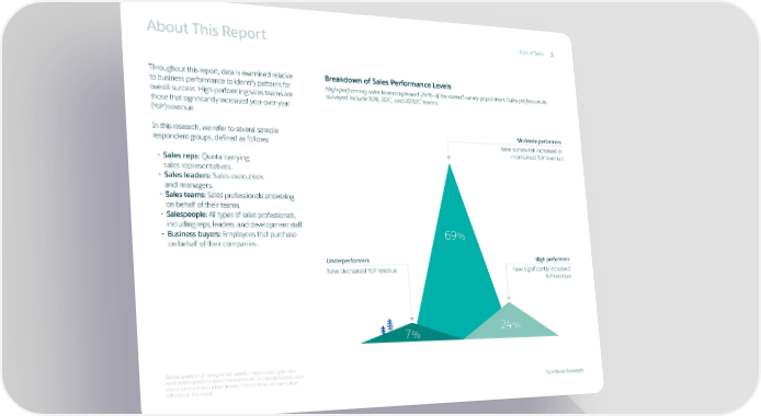 About This Report State of Sales 3 Throughout this report, data is examined relative Breakdown of Sales Performance Levels to business performance to identify patterns for High-performing sales teams represent 24% of the overall survey population. Sales professionals overall success. High-performing sales teams are surveyed include B2B, B2C, and B2B2C teams. those that significantly increased year-over-year (YoY) revenue. In this research, we refer to several sample Moderate performers respondent groups, defined as follows: have somewhat increased or maintained YoY revenue • Sales reps: Quota-carrying sales representatives. • Sales leaders: Sales executives and managers. • Sales teams: Sales professionals answering on behalf of their teams. • Salespeople: All types of sales professionals, including reps, leaders, and development staff. • Business buyers: Employees that purchase 69% on behalf of their companies. Underperformers High performers have decreased YoY revenue have significantly increased YoY revenue 7% 24% Survey question phrasing varied based on respondent type: reps were asked questions about themselves while managers/execs were asked questions about their teams. These differences may not be Salesforce Research reflected in the report.