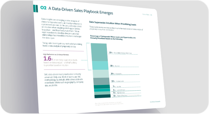 02 A Data-Driven Sales Playbook Emerges State of Sales 11 Data insights are emerging as the weapon of Data Supersedes Intuition When Prioritizing Leads choice for top sales teams, and lead prioritization is a prominent use case. In the past, sales reps relied Today’s sales teams are twice as likely to prioritize leads based on data analysis of on intuition when weighing which opportunities propensity to buy than on intuition. to pursue — and how to nurture them. Yet as reps’ mandate to develop deeper customer Percentage of Salespeople Whose Leads and Opportunities Are relationships has intensified, intuition is no longer Primarily Prioritized Based on the Following the status quo. Today, sales teams’ primary method of prioritizing leads is data analysis of propensity to buy. 33% Data analysis of propensity to buy High Performers vs. Underperformers 1.6X more likely to prioritize leads based on data analysis — and half as likely to prioritize based on intuition 16% Intuition Still, data-driven lead prioritization is hardly 14% Geography universal. Only one-third of teams use this methodology by default, while others stick with more basic criteria such as geography, company 13% Company size size, or job title. 7% Job title 5% Last in/first out 5% Alphabetically 6% None of the above (I don’t prioritize leads) Base: Sales representatives, executives, and managers See page 54 for data broken down by performance levels. Salesforce Research