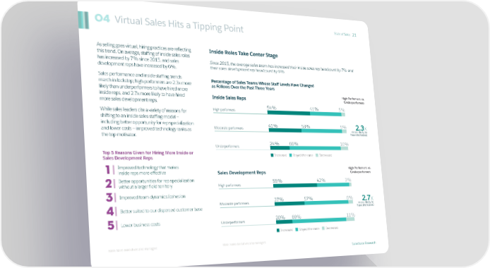 Virtual Sales Hits a Tipping Point State of Sales 21 04 As selling goes virtual, hiring practices are reflecting Inside Roles Take Center Stage this trend. On average, staffing of inside sales roles has increased by 7% since 2015, and sales Since 2015, the average sales team has increased their inside sales rep headcount by 7% and development reps have increased by 6%. their sales development rep headcount by 6%. Sales performance and inside staffing trends Percentage of Sales Teams Whose Staff Levels Have Changed march in lockstep; high performers are 2.3x more as Follows Over the Past Three Years likely than underperformers to have hired more High Perfomers vs. inside reps, and 2.7x more likely to have hired Inside Sales Reps Underperfomers more sales development reps. 54% 41% 5% While sales leaders cite a variety of reasons for High performers shifting to an inside sales staffing model — including better opportunity for rep specialization 41% 53% 5% 2.3x and lower costs — improved technology ranks as Moderate performers more likely to the top motivator. have increased Underperformers 24% 66% 10% Top 5 Reasons Given for Hiring More Inside or Increased Stayed the same Decreased Sales Development Reps 1 Improved technology that makes High Perfomers vs. inside reps more effective Sales Development Reps Underperfomers 2 Better opportunities for rep specialization 55% 42% 3% without a larger field territory High performers 3 Improved team dynamics/cohesion Moderate performers 37% 57% 6% 2.7x Better suited to our dispersed customer base more likely to 4 have increased 5 Lower business costs Underperformers 20% 69% 11% Increased Stayed the same Decreased Base: Sales executives and managers Base: Sales executives and managers Salesforce Research