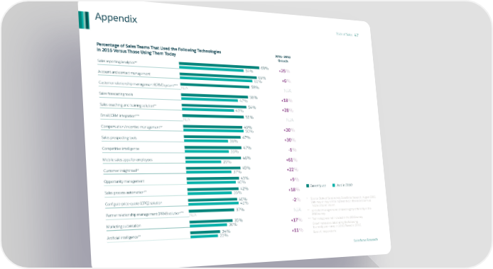 State of Sales 47 Appendix Percentage of Sales Teams That Used the Following Technologies 2016–2018 in 2016 Versus Those Using Them Today Growth Sales reporting/analytics** 68% +25% 54% Account and contact management 65% +6% 61% Customer relationship management (CRM) system*** 58% N/A N/A Sales forecasting tools 56% +18% 47% Sales coaching and training solution** 54% +28% 43% Email/CRM integration*** 51% N/A N/A Compensation/incentive management** 49% +30% 50% Sales prospecting tools 47% +30% 36% Competitive intelligence 47% -1% 36% Mobile sales apps for employees 46% +61% 29% Customer insight tool** 45% +22% 37% Opportunity management 43% +9% 40% 42% Currently use Used in 2016* Sales process automation** 36% +18% Configure-price-quote (CPQ) solution 40% -2% * Source: State of Sales survey, Salesforce Research, August 2016. 41% Data may or may not be represented in the second annual 37% “State of Sales” report. Partner relationship management (PRM) solution*** N/A N/A ** Some technologies were phrased slightly differently in the 2016 survey. Marketing automation 35% +17% *** Technology was not included in the 2016 survey. 30% Growth rates calculated using the following: Artificial intelligence** 24% +11% (currently use – used in 2016)/(used in 2016) 22% Base: All respondents Salesforce Research
